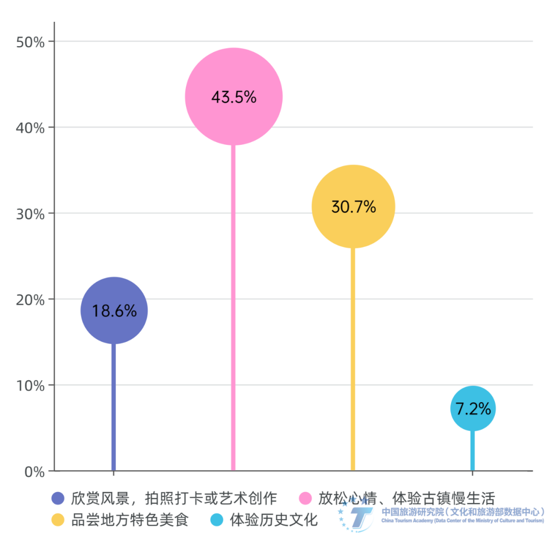 游客越来越追求在古镇空间内的情绪价值与闲适的氛围。在古镇旅游最吸引受访者的因素中,悠闲的生活氛围是最受欢迎的,占比达27.1%;其次是建筑风格与当地特色美食,占比分别为23.4%和20.7%;而历史文化、民俗活动、自然风光和环境等因素对受访者吸引力依次降低。与此同时,调查显示,前往古镇旅游的目的主要集中在放松心情、体验古镇慢生活(43.5%)、欣赏风景、拍照打卡或艺术创作(18.6%)以及品尝地方特色美食(30.7%)等方面。