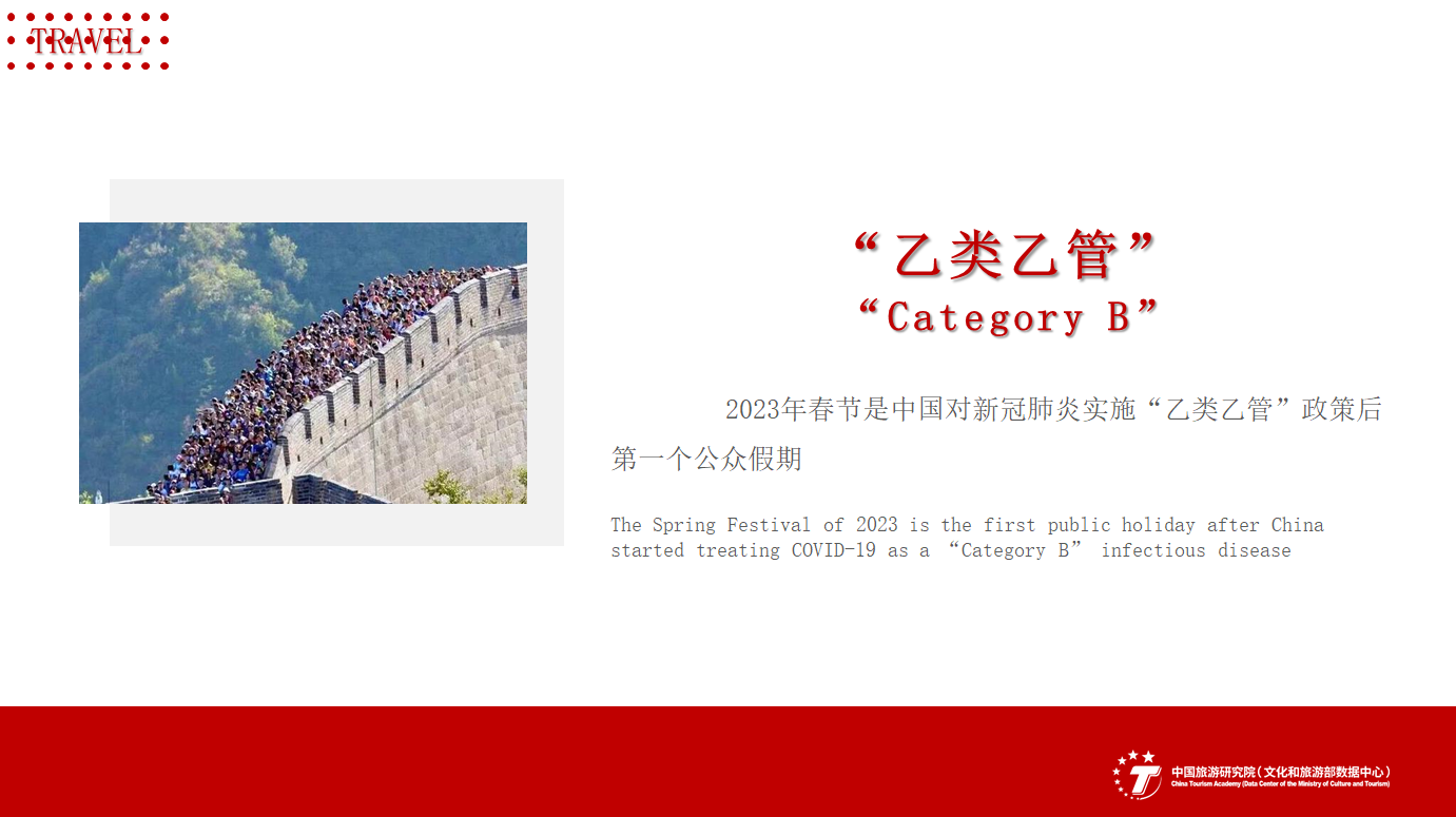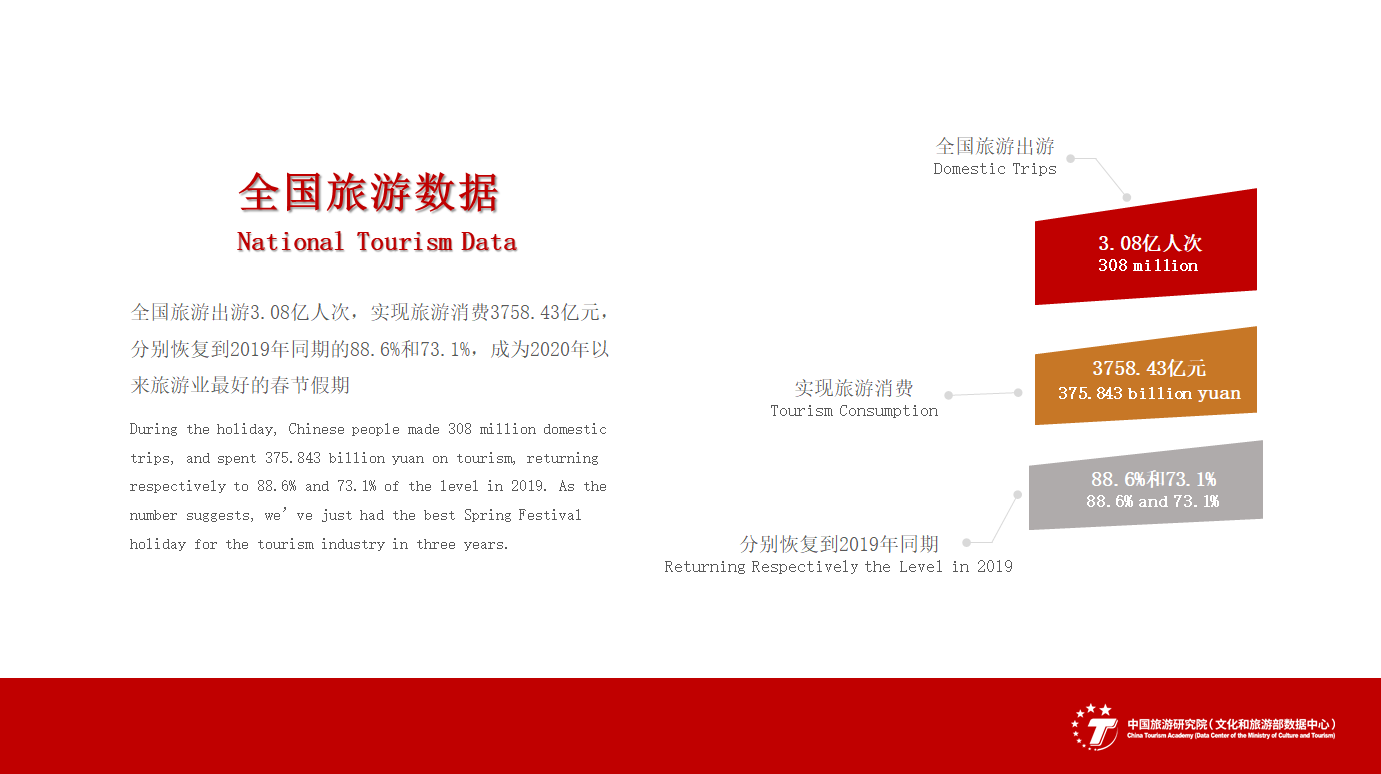 2023年春节是中国对新冠肺炎实施“乙类乙管”政策后第一个公众假期,全国旅游出游3.08亿人次,实现旅游消费3758.43亿元,分别恢复到2019年同期的88.6%和73.1%,成为2020年以来旅游业最好的春节假期。