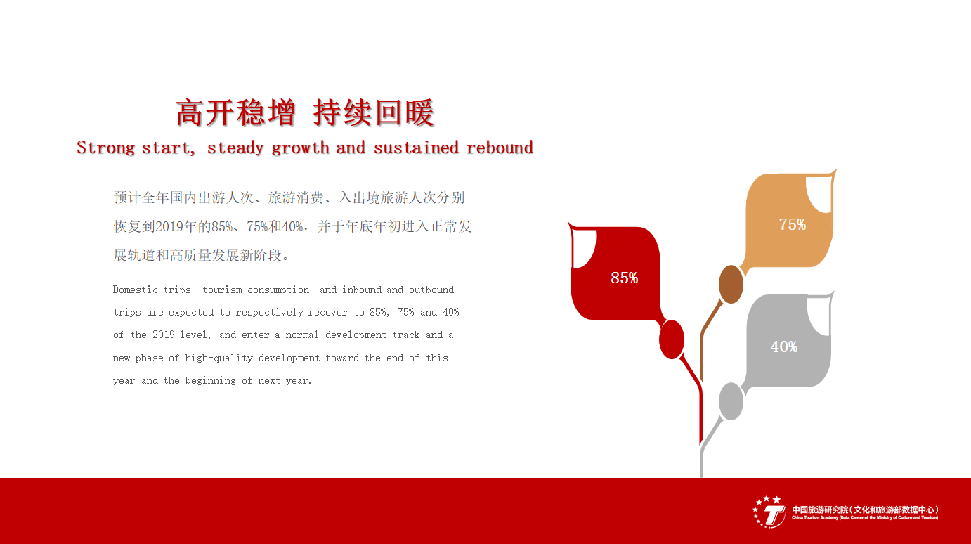 2月6日,中旅旅行、携程、广之旅、春秋、凯撒、中青旅等旅行社组织的多个出境游首发团,及其在泰国、菲律宾、印尼受到的礼遇,极大提振了旅游消费预期和市场信心,进一步奠定了全年旅游经济“高开稳增,持续回暖”的市场基础。基于财政、经济、消费、投资、民航、交通、入出境管理等宏观政策,以及居民出游意愿、员工招聘、企业家信心和目的地推广等先行指标的综合研判,我们有理由对2023年的中国旅游经济保持乐观预期。预计全年国内出游人次、旅游消费、入出境旅游人次分别恢复到2019年的85%、75%和40%,并于年底年初进入正常开展轨道和高质量开展新阶段。
