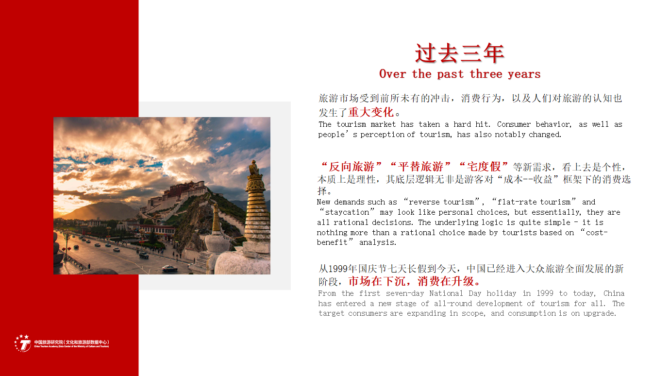 从1999年国庆节七天长假到今天,中国已经进入大众旅游全面开展的新阶段,市场在下沉,消费在升级。游客需求和消费行为的变化,必然影响商业供给和产业动能的创新,进而影响产业政策和规制体系的调整。从更为宏观的层面上看,中国已经完成脱贫攻坚、全面建成小康社会的历史任务,正在以中国式现代化全面推进中华民族伟大复兴。在这一战略背景下,旅游业需要新思维和新政策,有效提升市场推广、目的地建设、公共服务和产业创新水平。
