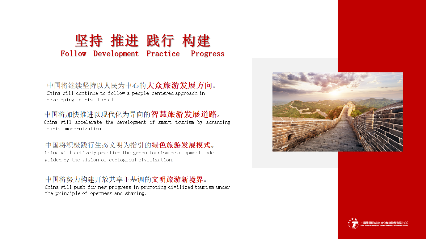中国将继续坚持以人民为中心的大众旅游开展方向。旅游是人民的权利,是日常的生活方式。让每一位国民有得游、游得起、游得开心、玩得放心,让诗和远方的梦想照进全面小康的现实,是新时代的国家旅游方略。今天,旅游已经成为国民大众的日常生活和多数人的刚性需求。去哪儿网的数据表明:购买人生第一张机票的主力群体的平均年龄,已经下沉到20至25岁,其中近一半游客来自三线及以下城市,包括内蒙古的阿尔山、青海的祁连、新疆的喀什、云南的楚雄……覆盖了1827个县级城市。这意味着越来越多的城乡居民有意愿,也有能力去远方欣赏不一样的美丽风景,体验高品质的美好生活。与此同时,我们也要看到疫情前年均4.3次的国民出游率、人均7.82天的出游时间、节假日平均270公里的出游距离、人均每次940元的旅游花费,与人民对小康社会旅游梦想的期待还有很大的努力空间。